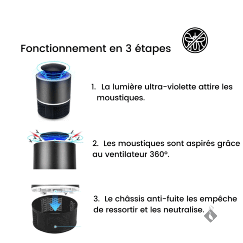 Dotée d’une lampe LED bleue et écologique sans radiation et spécialement conçue pour attirer les moustiques avec un système d’aspiration intelligent et silencieux.