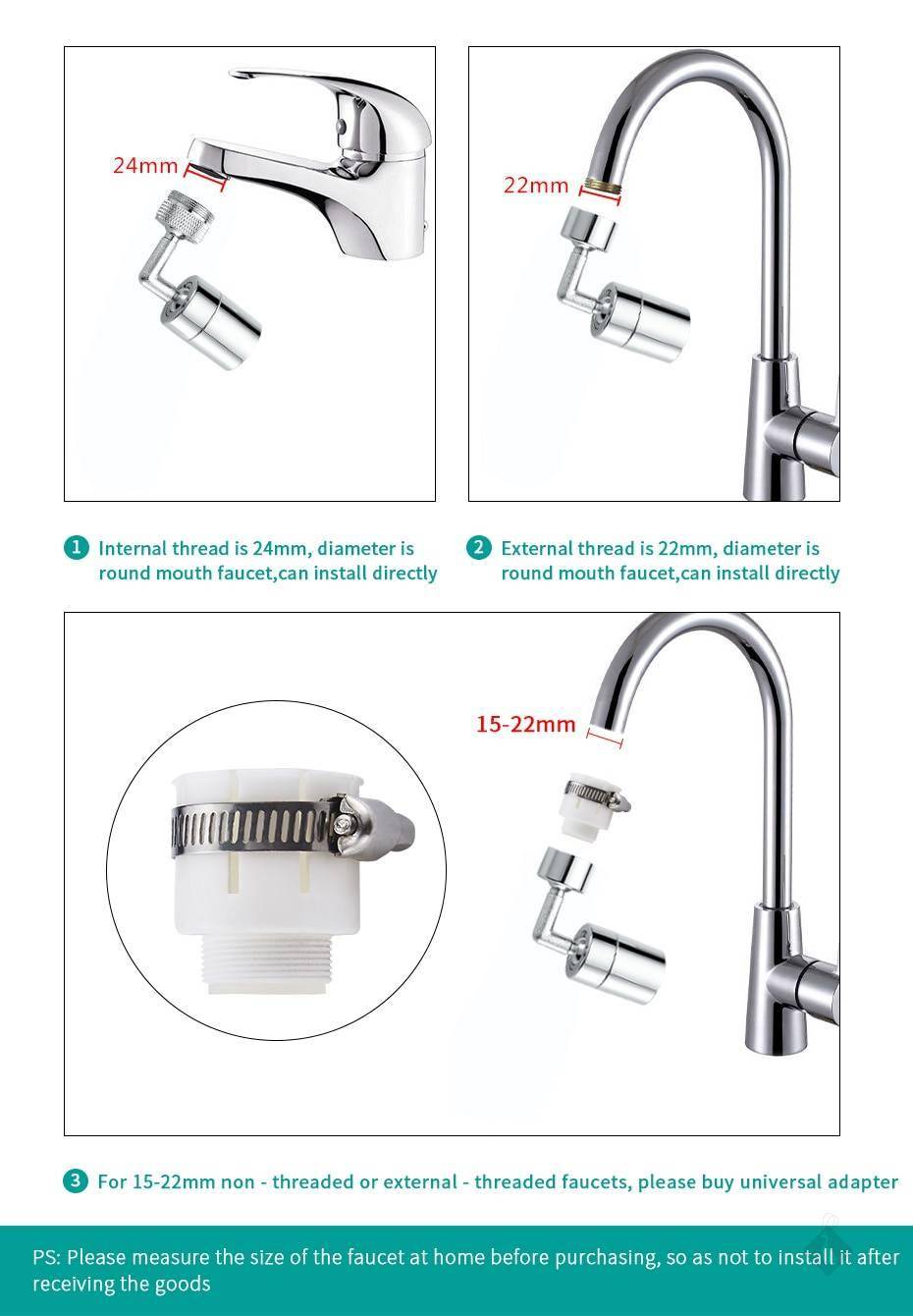 (3). Pour les robinets à bec rond avec un diamètre de filetage externe de 22mm ou un diamètre de filetage interne de 24mm, les deux peuvent être installés directement. Veuillez acheter l’adaptateur M22 à m24.